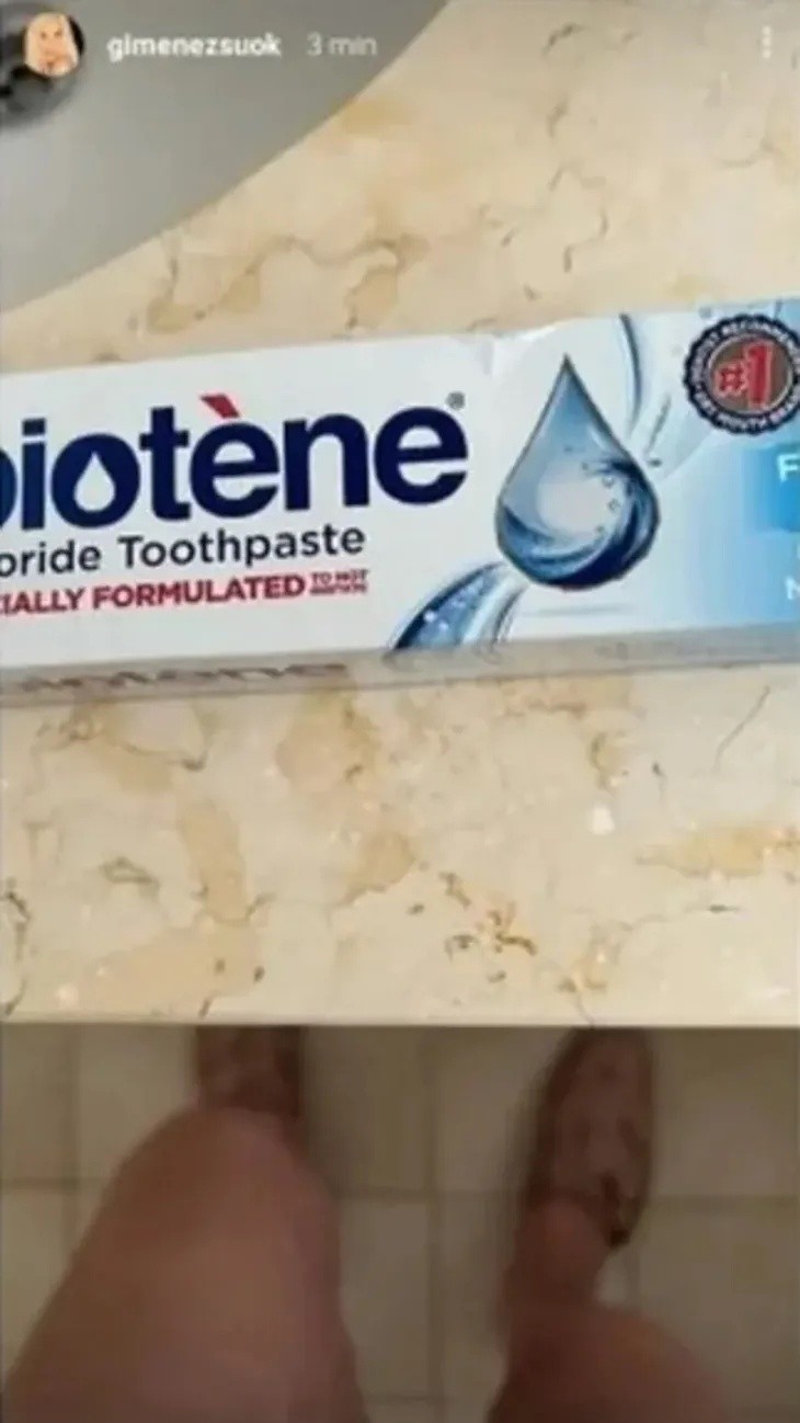 La conductora compartió una instantánea en la que se ve una pasta dental y una mesada de baño. A la vez, fuera de foco, se observan sus piernas y sus pies en pantuflas.