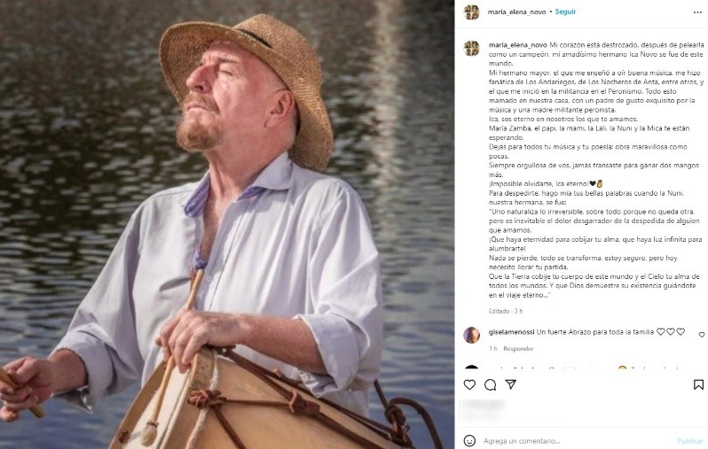 "Mi corazón está destrozado, después de pelearla como un campeón, mi amadísimo hermano Ica Novo se fue de este mundo. Mi hermano mayor, el que me enseñó a oír buena música, me hizo fanática de Los Andariegos, de Los Nocheros de Anta, entre otros, y el que me inició en la militancia en el peronismo. Todo esto mamado en nuestra casa, con un padre de gusto exquisito por la música y una madre militante peronista. Ica, sos eterno en nosotros los que te amamos", escribió su hermana.