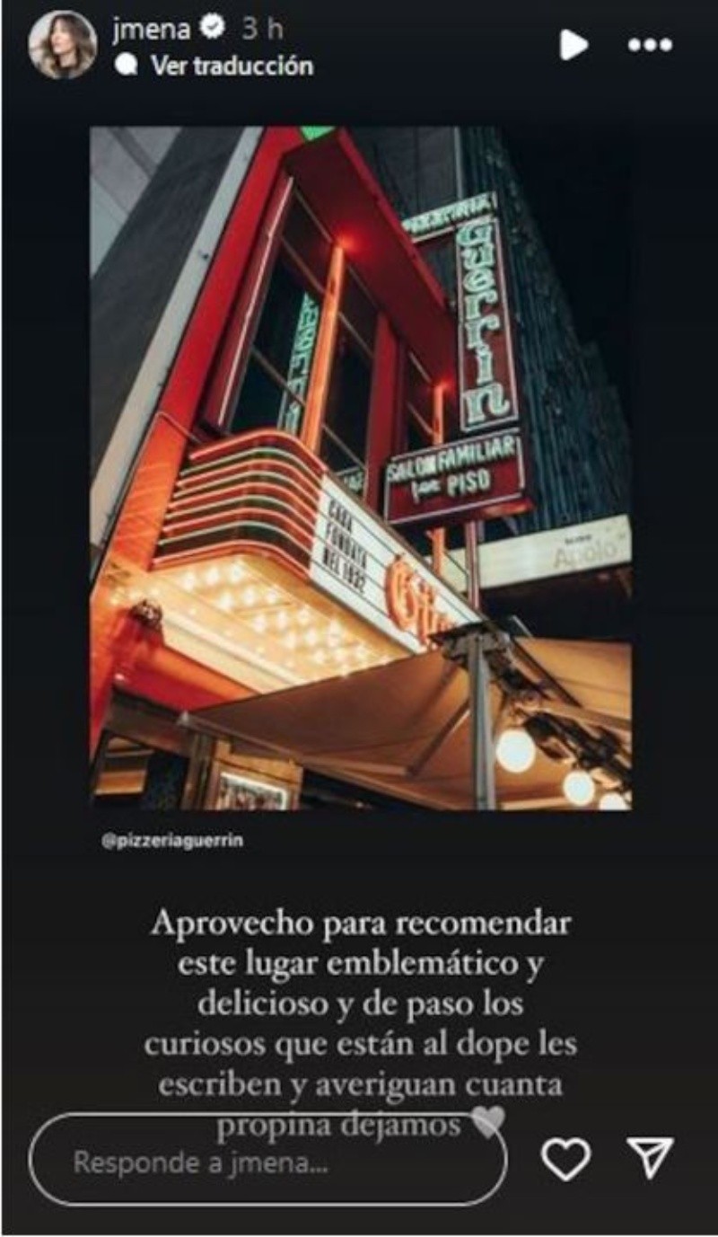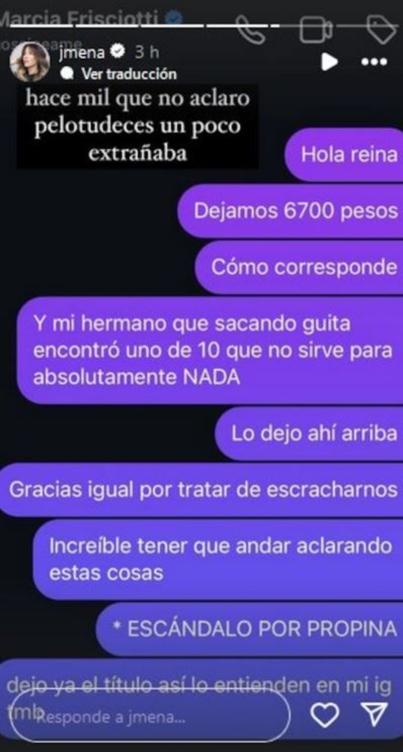 Inmediatamente a eso, Jimena texteó irónica: “Gracias igual por tratar de escracharnos. Increíble tener que andar aclarando estas cosas”. Y agregó: "«Escándalo por propina», dejo ya el título, así lo entienden en mi IG también”.