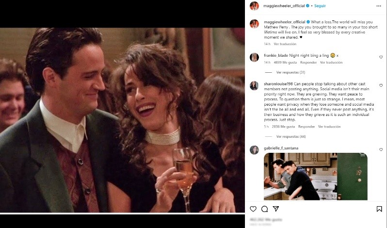 La primera en expresarse fue Maggie Wheeler, que caracterizó a Janice Litman Goralnik en la ficción. La actriz publicó en Instagram una foto donde se la ve sonriendo junto a su compañero. "Qué pérdida. El mundo te va a extrañar, Matthew Perry", lamentó.