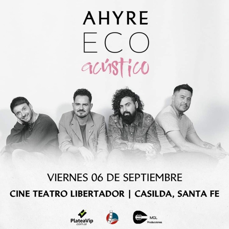 Este viernes 6 de septiembre, Ahyre presentará "Eco Acústico", su último y galardonado trabajo, en el Cine y Teatro Libertador de Casilda. Será una oportunidad inmejorable para que todos los amantes de la música de esta región puedan disfrutar de este cuarteto de grandes músicos, integrado por Juan José Vasconcellos, Sebastián Giménez, Hernando Mónico y Federico Maldonado, que cuentan con la colaboración de Guido Bertini en percusión y batería. Las entradas se pueden adquirir a través del sitio Platea Vip.