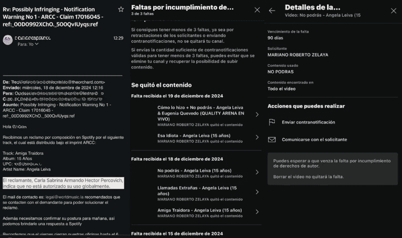 La víctima compartió las capturas que demuestran que Mariano Zelaya intenta, en reiteradas ocasiones, denunciar su música en YouTube, con el fin de frenar su difusión.