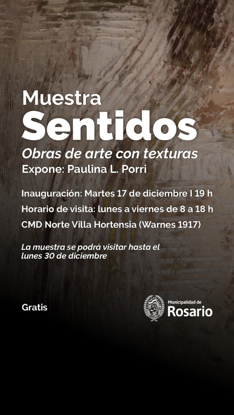 Hasta el próximo lunes 30 de diciembre el Centro Municipal de Distrito Norte “Villa Hortensia” mantendrá en exposición la muestra “Sentidos” de la artista plástica Paulina Porri. Se trata de una colección de obras que invitan al espectador . ir más allá de lo visual.