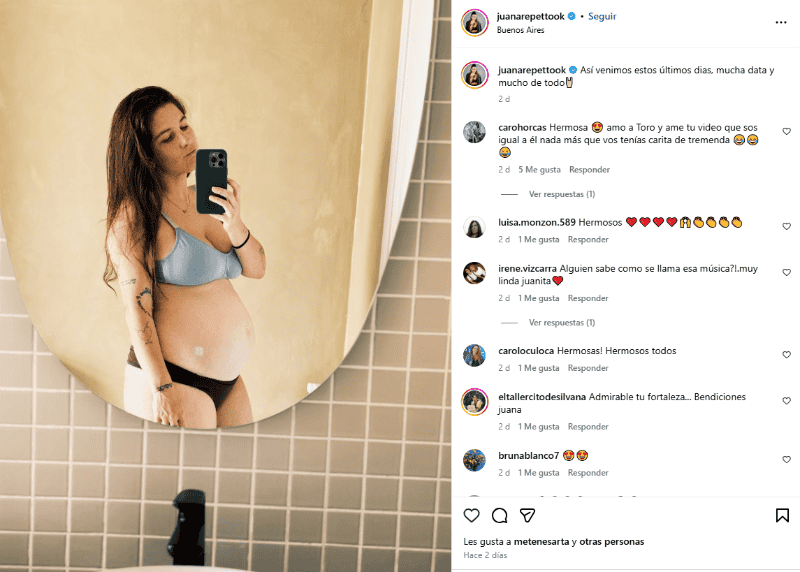 Sin maquillaje y con el cabello suelto, Repetto acompañó el posteo con la frase: “Así venimos los últimos días. Mucha data y mucho de todo”. En una publicación previa en redes sociales, la hija de Reina Reech y Nicolás Repetto adelantó que se trata de un varón.