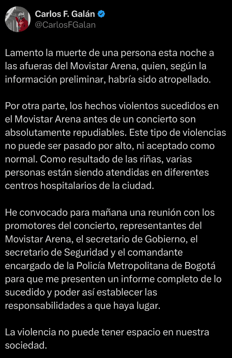 “Desde el Movistar Arena lamentamos profundamente los hechos ocurridos durante el evento de hoy (por ayer). La administración del espacio tuvo como prioridad proteger a los asistentes y colaboradores, y suspender el espectáculo para que las autoridades pudieran intervenir y recuperar el orden. Por motivos de seguridad y debido a actos violentos presentados por algunos asistentes, nos hemos visto en la obligación de cancelar el concierto”, se informó en un comunicado.