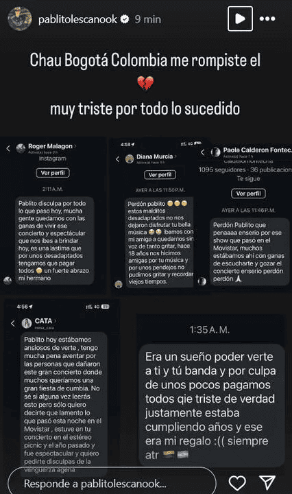 Pablo Lezcano escribió en una historia de su cuenta de Instagram: “Chau Bogotá, Colombia. Me rompiste el corazón. Muy triste por todo lo sucedido”. El músico sumó capturas de pantallas de fanáticos apenados por la situación.