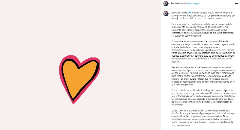 Así, en las últimas horas el modista rompió el silencio e hizo uso de sus redes sociales para compartir un comunicado.