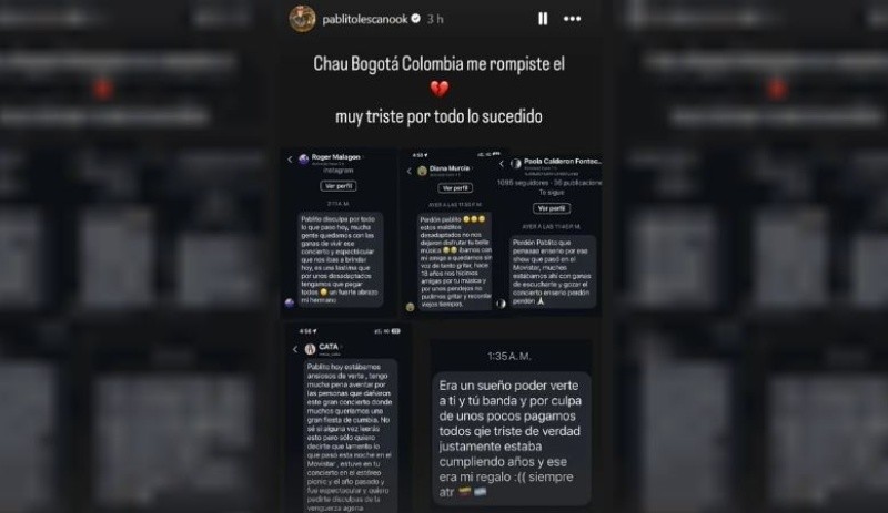 “Chau Bogotá, Colombia me rompiste el corazón", escribió Pablo Lescano, cantante de la banda, luego de los incidentes. "Muy triste por todo lo sucedido”, sumó en la publicación que hizo y donde compartió capturas de mensajes directos de seguidores y miembros de la organización del evento pidiendo disculpas o deseando verlo tocar.