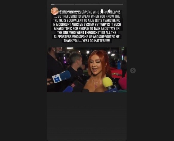 “Yo amo y adoro a todos los que me apoyaron… pero rehusarte a hablar cuando sabes toda la verdad es equivalente a una mentira“, escribió Britney desde su cuenta verificada en Instagram y agregó: “13 años de estar en un sistema corrupto y abusivo, ¿por qué es un tema tan difícil de hablar para la gente? Yo fui la que lo vivió. A todos los que me apoyaron y alzaron la voz, gracias… Sí, yo sí importo“.