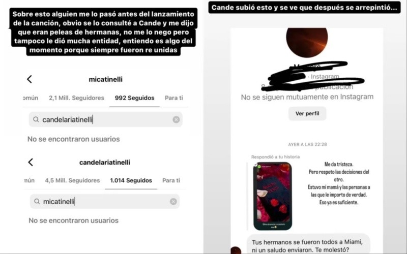Cande y Mica Tinelli se dejaron de seguir en las redes sociales y estallaron los rumores de un distanciamiento entre las hermanas. La primicia la dio a conocer la influencer que "investiga a los famosos", Juariu, y desde entonces, los seguidores de las hijas mayores de Marcelo no tardaron en especular sobre los motivos de la pelea.