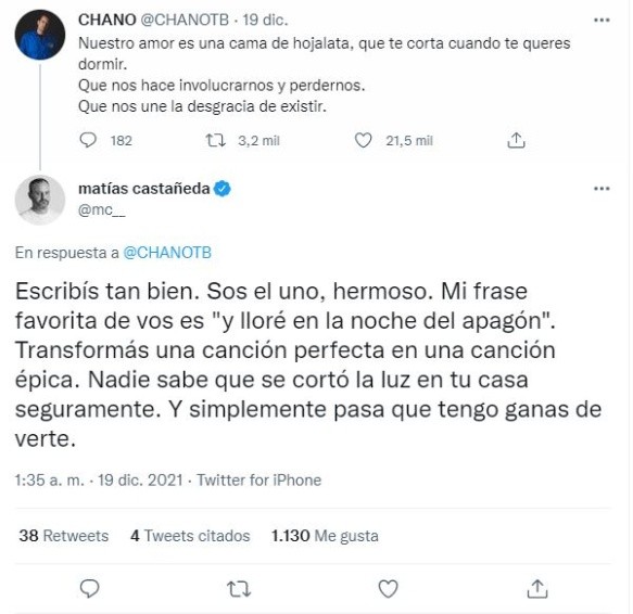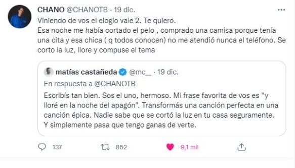 Al respecto, Chano reveló el detrás de escena de la letra en cuestión. "Viniendo de vos el elogio vale 2. Te quiero. Esa noche me había cortado el pelo, comprado una camisa porque tenía una cita y esa chica (que todos conocen) no me atendió nunca el teléfono. Se cortó la luz, lloré y compuse el tema", contó, y no tardó en volverse viral.