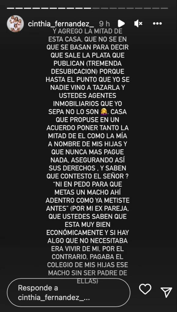 En relació a esto contó que le propuso a su ex poner la casa a nombre de sus hijas pero él no aceptó. “Casa que propuse, en un acuerdo, poner tanto la mitad de él como la mía a nombre de mis hijas y que nunca más pague nada. Asegurando así sus derechos. Y, ¿saben qué contesto el señor? ‘Ni en pedo para que metas un macho ahí adentro como ya metiste antes’ (Por mi ex pareja que ustedes saben que esta muy bien económicamente)”, explicó.