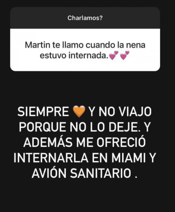 Acostumbrada a interactuar con sus seguidores a través de su cuenta de Instagram, Fernández respondió a la pregunta de uno de ellos sobre cómo actuó el rosarino cuando Francesca estaba internada. "¿Martín te llamó cuando la nena estuvo internada?", le escribieron. "Siempre, y no viajó porque no lo dejé. Además, me ofreció internarla en Miami y un avión sanitario", respondió.