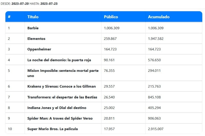 Según cifras de Ultracine, 1.747.000 personas asistieron a los cines de jueves a domingo, una cifra que constituye el mejor fin de semana en salas argentinas en la pospandemia. La gran protagonista de la taquilla fue la película Barbie, estrenada el último jueves, que convocó a 1.006.309 asistentes en el citado plazo.