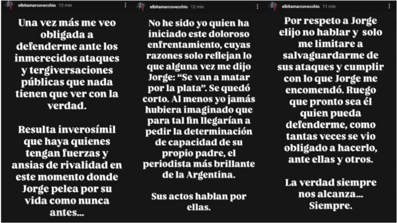 "No he sido yo quien ha iniciado este doloroso enfrentamiento, cuyas razones solo reflejan lo que alguna vez me dijo Jorge: «Se van a matar por la plata». Se quedó corto. Al menos yo jamás hubiera imaginado que para tal fin llegarían a pedir la determinación de capacidad de su propio padre, el periodista más brillante de la Argentina. Sus actos hablan más por ellas", siguió.