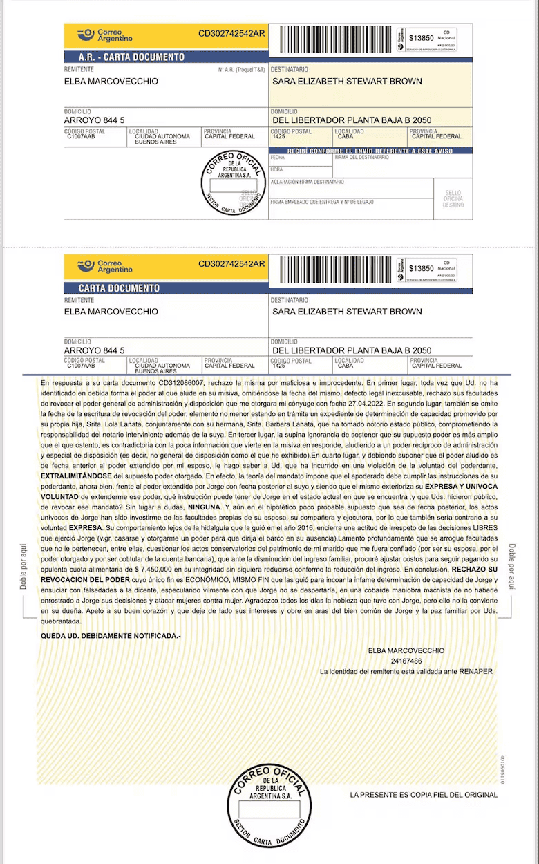 Por otra parte, la carta de documento que le envió Marcovecchio a Sara Stewart Brown consigna: "Su comportamiento lejos de la hidalguía que la guió en el año 2016 encierra una actitud de irrespeto de las decisiones libres que ejerció Jorge, por ejemplo casarse y otorgarme un poder para que dirija el barco en su ausencia".