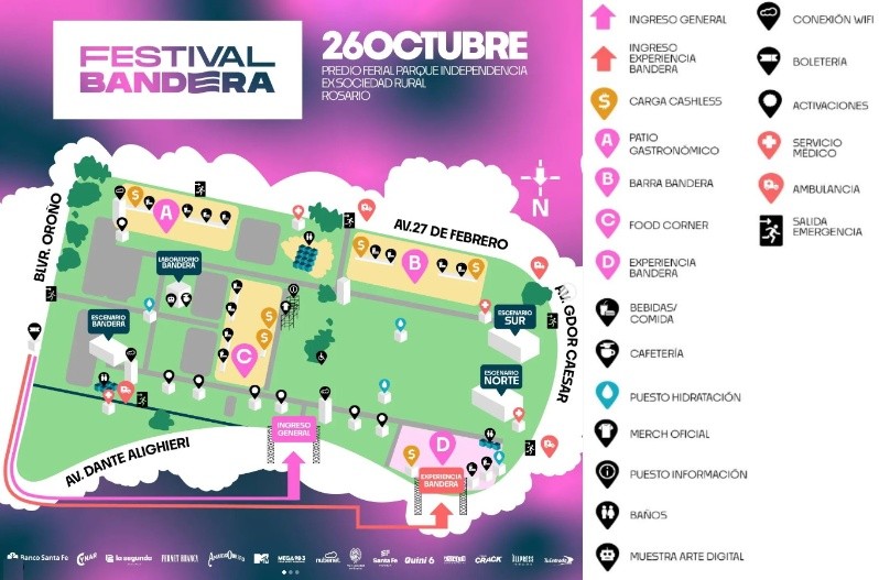 Los Escenarios Norte y Sur se encuentran uno al lado del otro (de espaldas a la avenida Gobernador Caesar) y no se superponen sus artistas programados. En el otro extremo (de espaldas a Oroño), estarán montados el Escenario Bandera y el Laboratorio Bandera.