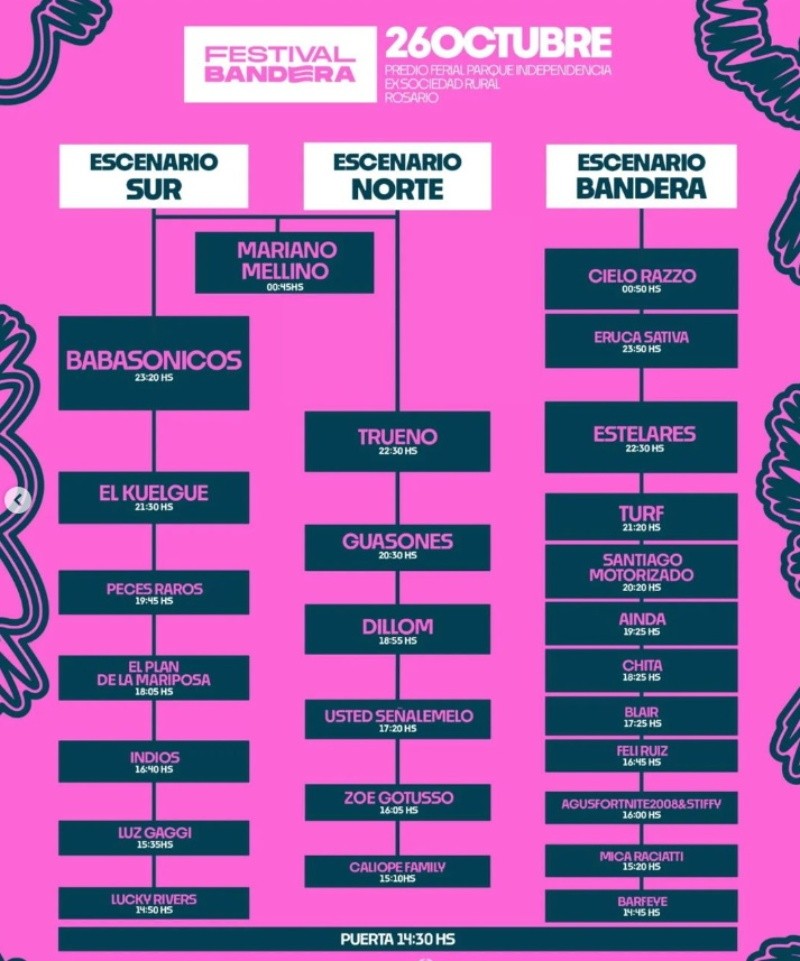 El line up es el siguiente: Trueno, Babasónicos, Dillom, Zoe Gotusso, Estelares, Guasones, El Kuelgue, Turf, Indios, Mariano Mellino, Santiago Motorizado, El Plan de la Mariposa, Ainda, Cielo Razzo y Usted Señálemelo, Eruca Sativa, Chita, Luz Gaggi, Blair, Feli Ruiz, Caliope Family, AgusFornite2008 & Stiffy, Lucky Rivers, Mica Racciatti y Barfeye.