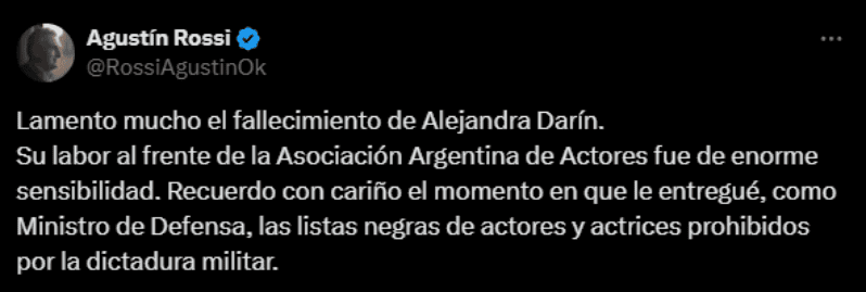"Lamento mucho el fallecimiento de Alejandra Darín. Su labor al frente de la Asociación Argentina de Actores fue de enorme sensibilidad. Recuerdo con cariño el momento en que le entregué, como Ministro de Defensa, las listas negras de actores y actrices prohibidos por la dictadura militar", señaló Agustín Rossi en X.