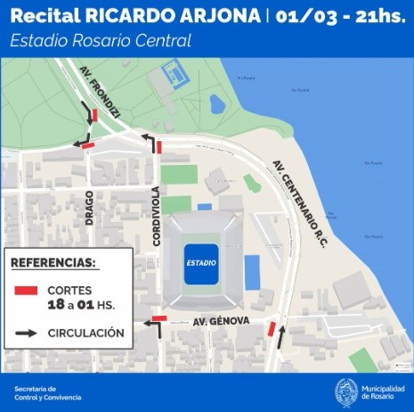 Con motivo del recital de Ricardo Arjona de este miércoles a las 21 estadio de Rosario Central, la Municipalidad comunicó los cortes y ordenamiento de tránsito en las inmediaciones del gigante de Arroyito. Los cortes comenzaron a las 18 y concluirán una vez finalizado el evento en: Av. de los Trabajadores y Arturo Frondizi