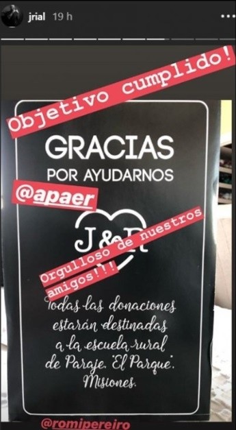 "Gracias a ustedes juntamos 90.250 pesos. Con eso, los chicos de la escuela rural El Paraje ya tienen su baño. Gracias por la generosidad y el esfuerzo. Estamos orgullosos de ustedes".