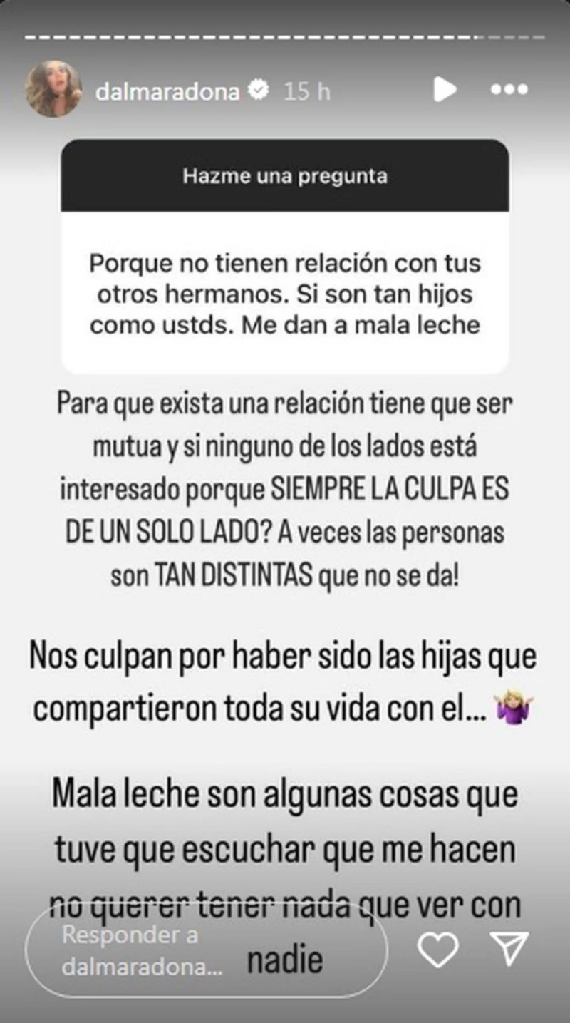 En las últimas horas, Dalma Maradona realizó en sus redes la conocida dinámica de preguntas y respuestas para contactar con sus seguidores. Un internauta aprovechó la ocasión y fue directo a la yugular de la actriz con su consulta: "¿Por qué no tienen relación con tus otros hermanos si son tan hijos como ustedes? Me dan a mala leche".