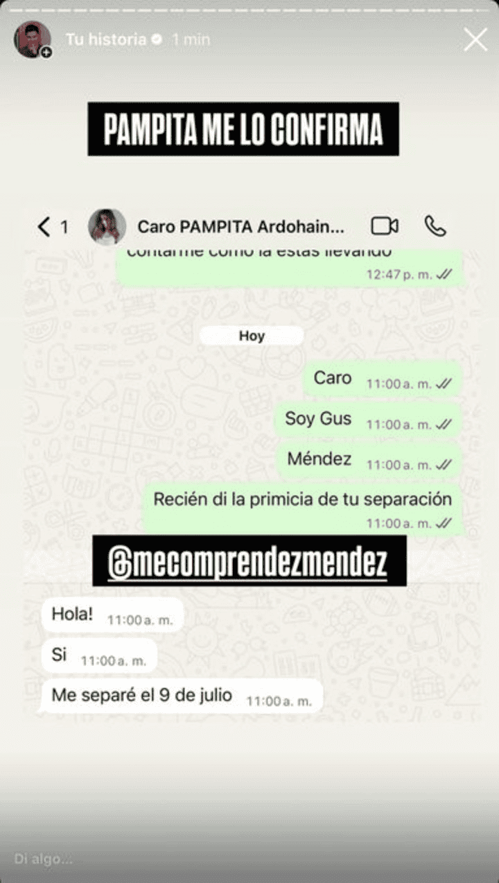 Más tarde, el periodista compartió en redes sociales una captura de pantalla de la conversación con la modelo oriunda de La Pampa, quien le confirmó que la separación ocurrió el pasado 9 de julio.