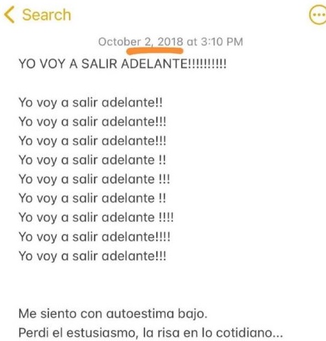Por último, publicó otra foto que muestra un pensamiento escrito por ella en octubre de 2018: “¡Ya voy a salir adelante! Me siento con autoestima baja. Perdí el entusiasmo, la risa en lo cotidiano”, manifestó, además de reiterar varias veces "¡Ya voy a salir adelante!".