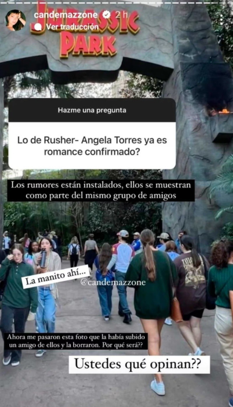 En ese marco, les tomaron una fotografía en la que se los ve caminando juntos hacia la atracción de Jurassic Park. Según como se mire la imagen, una mano de Rusher parece ir en el bolsillo de Ángela,