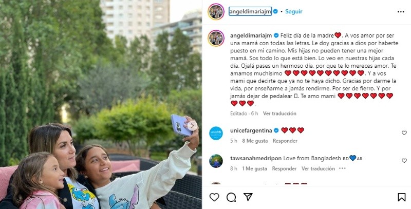 Una de las publicaciones más dulces fue la de Ángel Di María. El rosarino compartió dos fotos de sus hijas (Mía y Pía) junto a Jorgelina Cardoso, su esposa, y su mamá, Diana Gómez.
