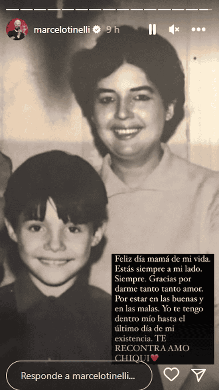 Marcelo Tinelli también recordó a su mamá: "Feliz día mamá de mi vida. Estás siempre a mi lado. Siempre. Gracias por darme tanto tanto amor. Por estar en las buenas y en las malas. Yo te tengo dentro mío hasta el último día de mi existencia. Te recontra amo Chiqui", redactó el conductor.