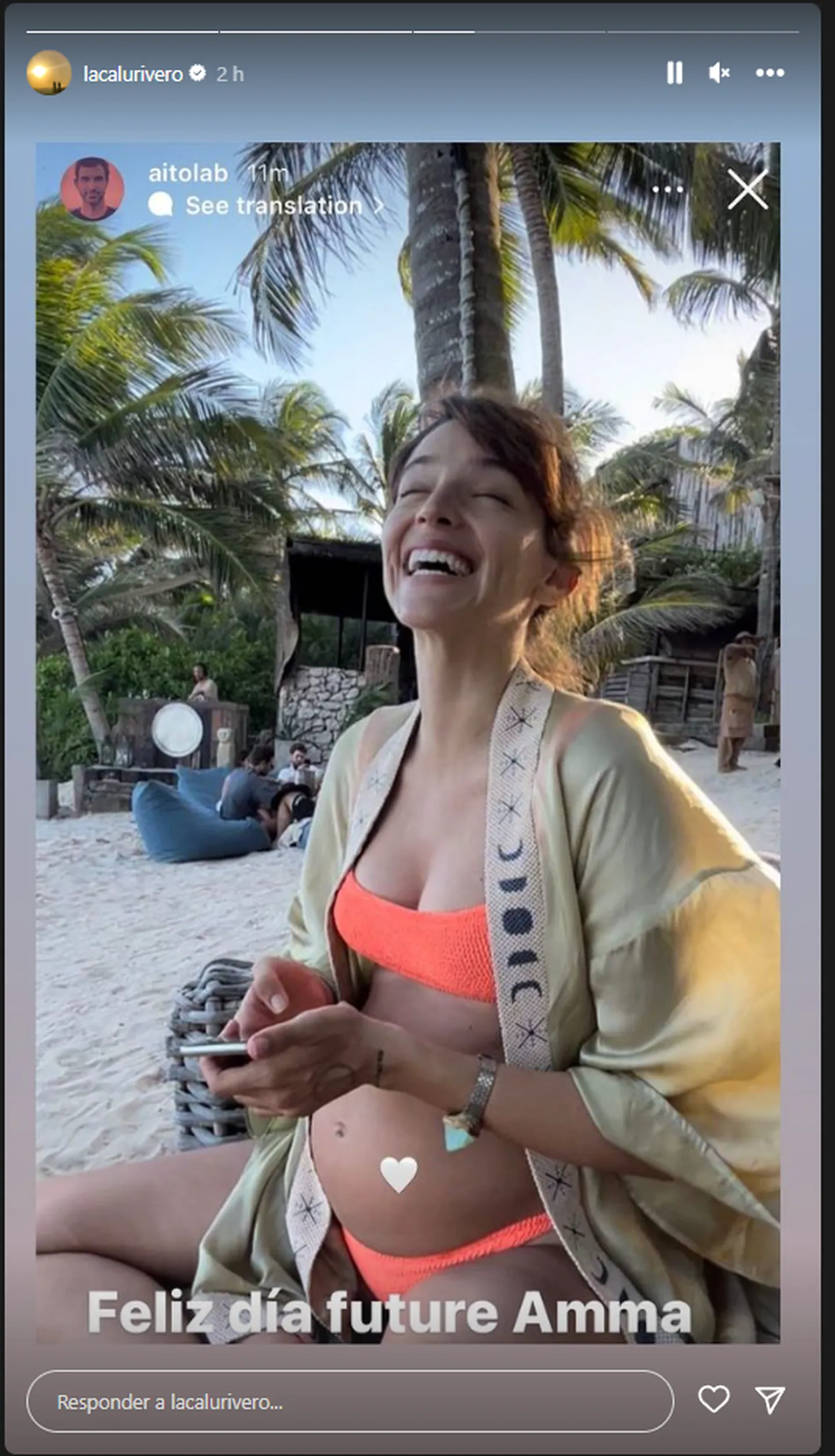 En sus historias de Instagram, Aíto compartió una foto de Calu en bikini mostrando la panza de embarazo y escribió: "Feliz día future Amma". La influencer compartió esa dedicatoria en sus redes sociales y reaccionó con el emoji de un corazón blanco.