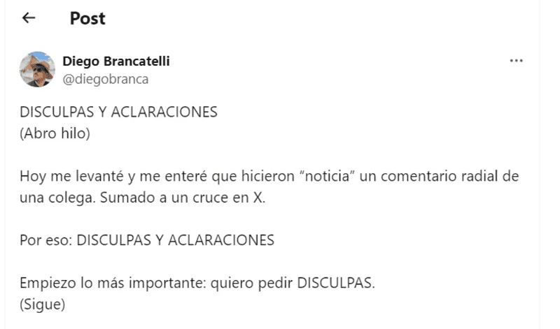 "Hoy me levanté y me enteré que hicieron noticia un comentario radial de una colega. Sumado a un cruce en X. Por eso, disculpas y aclaraciones", comenzó.