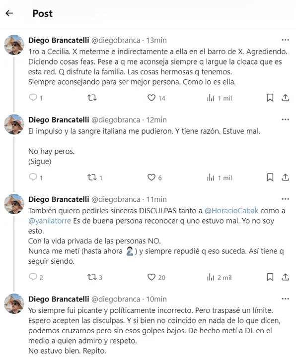 Y siguió: "El impulso y la sangre italiana me pudieron. Y tiene razón. Estuve mal. No hay peros. También quiero pedirles sinceras disculpas tanto a Horacio Cabak como a Yanina Latorre. Es de buena persona reconocer que uno estuvo mal. Yo no soy esto. Con la vida privada de las personas, no. Nunca me metí (hasta ahora) y siempre repudié que eso suceda. Así tiene que seguir siendo".