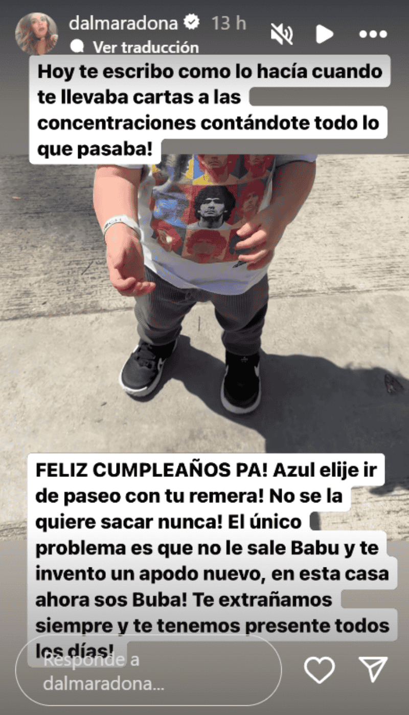Otro en compartir algo fue Diego Maradona Junior. "¡Feliz cumple Pá! A vos que nos enseñaste que todo es posible! A vos que con una pelota de fútbol le ganaste a los poderes fuertes del mundo! A vos que sos rey, el rey de la gente! A donde estés que te llegue mi beso, mi vida!", dijo.