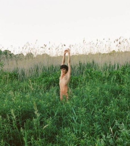 En la imagen, Dignity extiende los brazos hacia arriba, completamente desnufa. La forestaión le cubre los genitales y el blureo hace el resto.