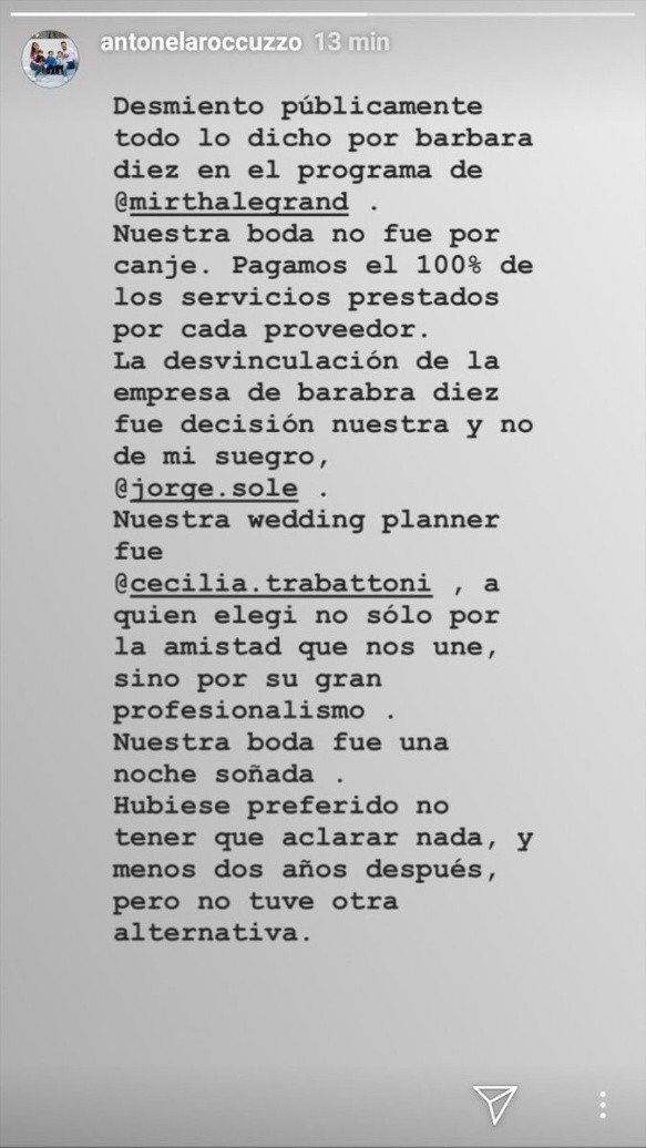 "Nuestra boda no fue por canje. Pagamos el 100% de los servicios prestados por cada proveedor. La desvinculación de la empresa de Bárbara Diez fue decisión nuestra y no de mi suegro", agregó.