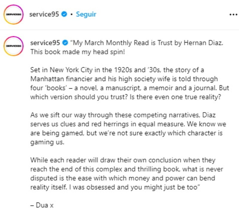S95 Book Club es una comunidad lectora en la que cada mes se discute “un libro elegido personalmente por Dua, que representa escritura de todo el mundo”. El club de lectura es abierto.