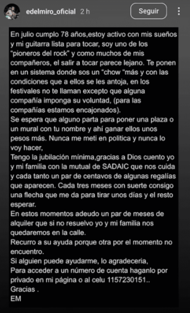 "En julio cumplo 78 años, estoy activo con mis sueños y la guitarra lista para tocar, soy uno de los pioneros del rock y como mucho de mis compañeros, el salir a tocar parece lejano", escribió el músico y agregó: "Te ponen en un sistema que sos un 'chow' más y con las condiciones que a ellos se les antoja, en los festivales no te llaman excepto que alguna compañía imponga su voluntad (para las compañías estamos encajonados)".