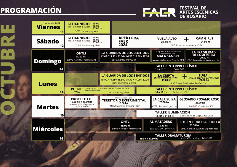 Durante cinco días, se presentarán obras de teatro, circo, performances, intervenciones callejeras y hasta una instalación inmersiva para bebés, que estarán programadas en seis espacios de Rosario (CEC, CCPE, Plataforma Lavarden, Museo de la Memoria, teatro de la Asociación Empleados de Comercio y Refi) y en la sala Gracias al Paraná, de Arroyo Seco, que se suma por primera vez como subsede del festival, inaugurando así el alcance del FAER a otras localidades santafesinas.