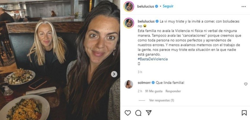 La influencer reconoció que los ataques a Emily están afectando a todo su entorno. “La vi muy triste (a mi mamá) y la invité a comer, con boludeces no”, advirtió en un posteo de Instagram. Y agregó: “Esta familia no avala la violencia ni física ni verbal de ninguna manera”.