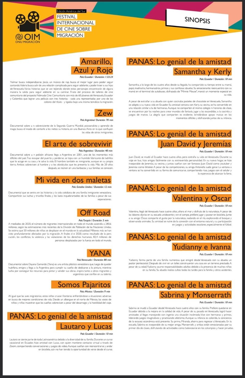 Según refiere el portal de la organización del encuentro, “a lo largo de los años, las películas han servido para informar, entretener, educar y generar debates. Es con este espíritu que la OIM, en su calidad de Organismo de las Naciones Unidas para la Migración, lanzó el Festival Internacional de Cine sobre Migración en 2016”.