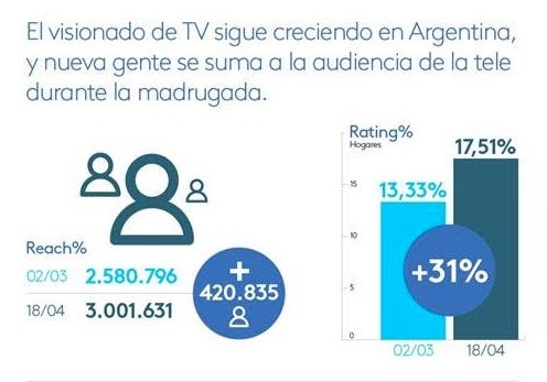 El consumo de TV durante la madrugada registró un crecimiento del 31 por ciento durante el período de cuarentena obligatoria, pasando de 2.580.796 espectadores el 2 de marzo a 3.001.631 de televidentes el 18 de abril, de acuerdo a mediciones de Kantar Ibope Media Argentina.