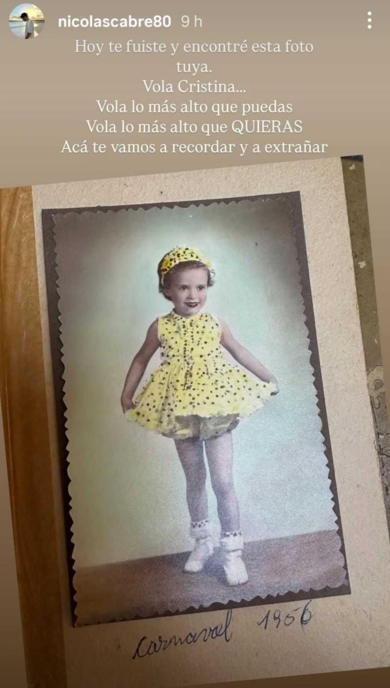 "Hoy te fuiste y encontré esta foto. Volá Cristina... volá lo más alto que puedas. Volá lo más alto que quieras. Acá te vamos a recordar y extrañar", escribió junto a una foto de su madre cuando era una niña y posaba en el Carnaval de 1956.