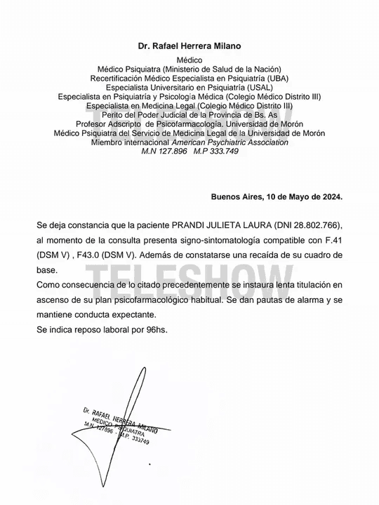 "Como consecuencia de la citado precedentemente se instaura lenta titulación en ascenso de su plan psicofarmacológico habitual y se dan pautas de alarma y se mantiene conducta expectante. Se determinó que el reposo laboral sea comprendido por el término de 96 horas", concluye.