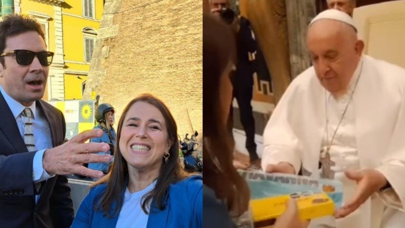 A través de sus redes sociales, la humorista compartió un video de lo que fue el mano a mano con Francisco. "Te traje unos alfajores porque debés extrañarlos un poco. Estos son nuevos, con sal, y estos normales, por su no podés comer con sal", le dijo sobre el producto de una reconocida marca argentina.