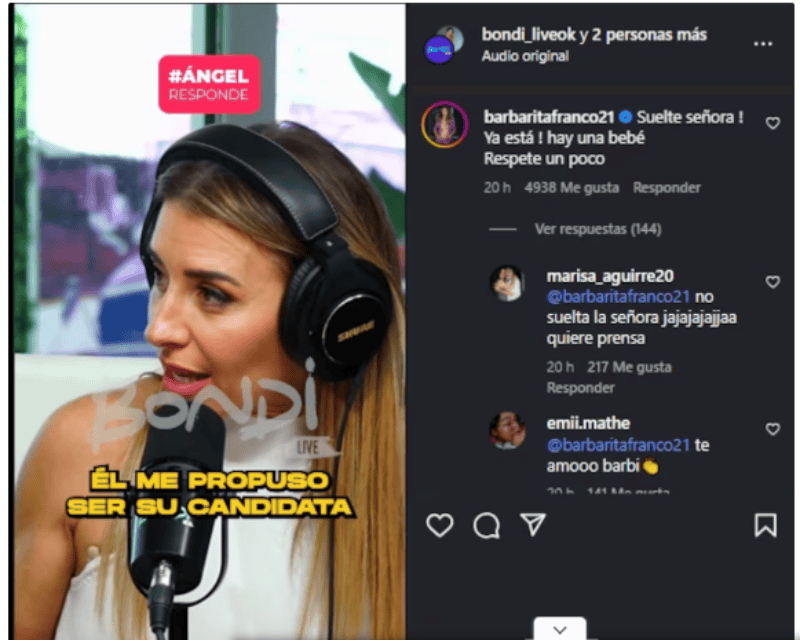 Lo cierto es que no es la primera vez que Mariana Brey revive públicamente su historia con el abogado. Y, como tantas otras veces, la reacción no tardó en llegar. Apenas el video empezó a circular por las redes del canal de streaming, Barby Franco respondió: “¡Suelte señora! ¡Ya está! Hay una bebé. Respete un poco”.