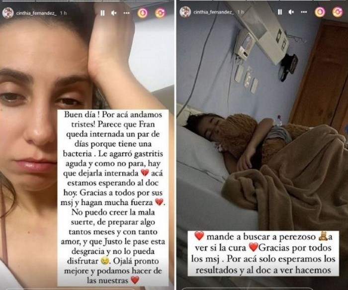 "Venía todo bárbaro hasta que terminamos así... Qué desgracia, che. Ya les contaré. Mi bebé está bien, le están pasando suero", explicó en otra historia junto a una imagen en la que se ve a la niña de siete años recostada sobre la camilla de un centro médico.
