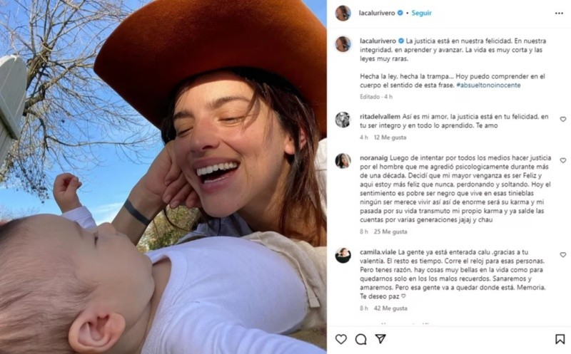 "La justicia está en nuestra felicidad. En nuestra integridad, en aprender y avanzar. La vida es muy corta y las leyes muy raras. Hecha la ley, hecha la trampa. Hoy puedo comprender en el cuerpo el sentido de esta frase", escribió en su cuenta de Instagram con una foto en la que aparece Tao, su hijo.