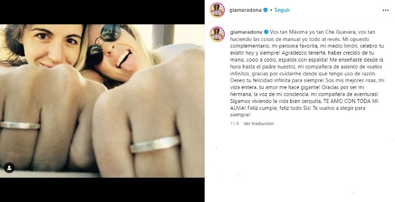 Junto una foto de ambas mostrando un anillo que comparten, Gianinna escribió: "Vos tan haciendo las cosas de manual, yo todo al revés. Mi opuesto complementario, mi persona favorita, mi medio limón, celebro tu existir hoy y siempre".